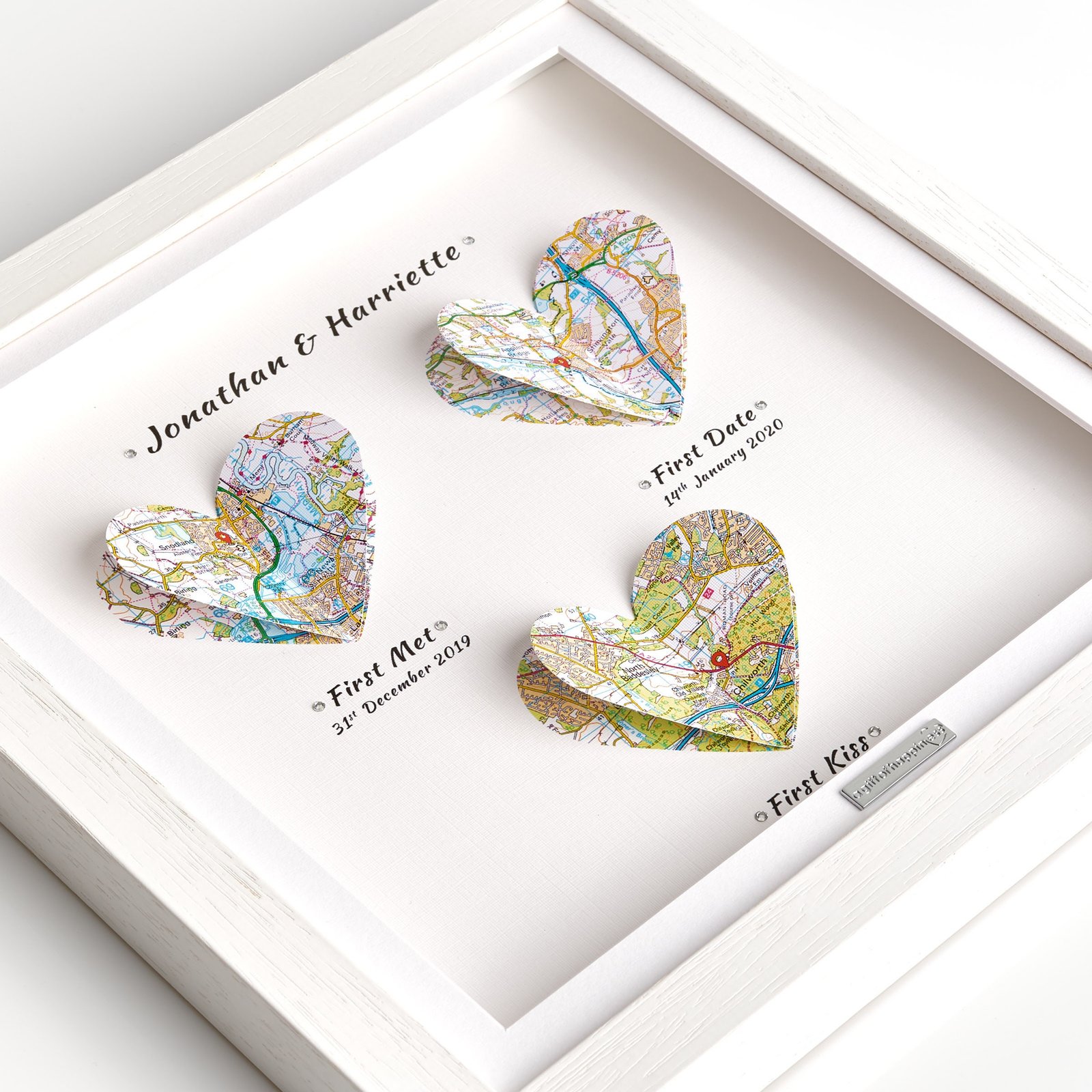 - Three heart-shaped maps displaying first meet, first date, and first kiss locations