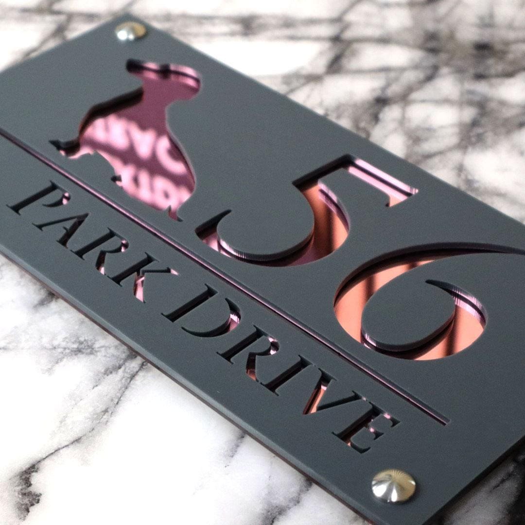 The design blends seamlessly into modern or classic home exteriors while still standing out enough to make an impression. Whether it’s the subtle shine of the copper mirror backing or the clean matte finish of the Perspex face, this sign reflects luxury from every angle.