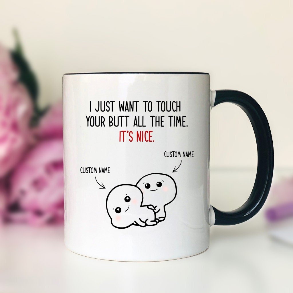 - Funny & Flirty Message With the iconic phrase “I Just Want To Touch Your Butt All The Time,” this mug is a fun and unique way to say “I love you” with personality.