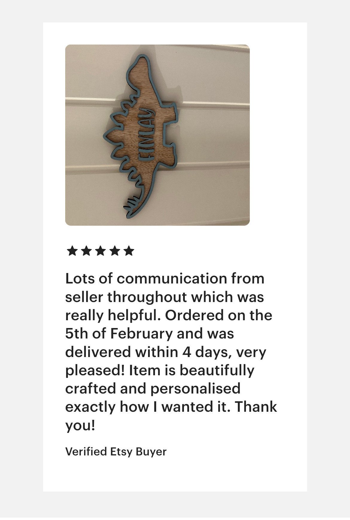 - 🎨 Fully Customisable Options Choose your favourite dinosaur style, colour theme, and letter design – tailor-made to match your room décor or your child’s favourite colour.