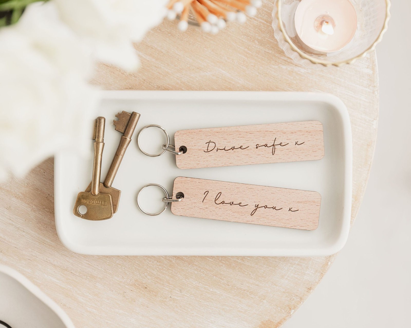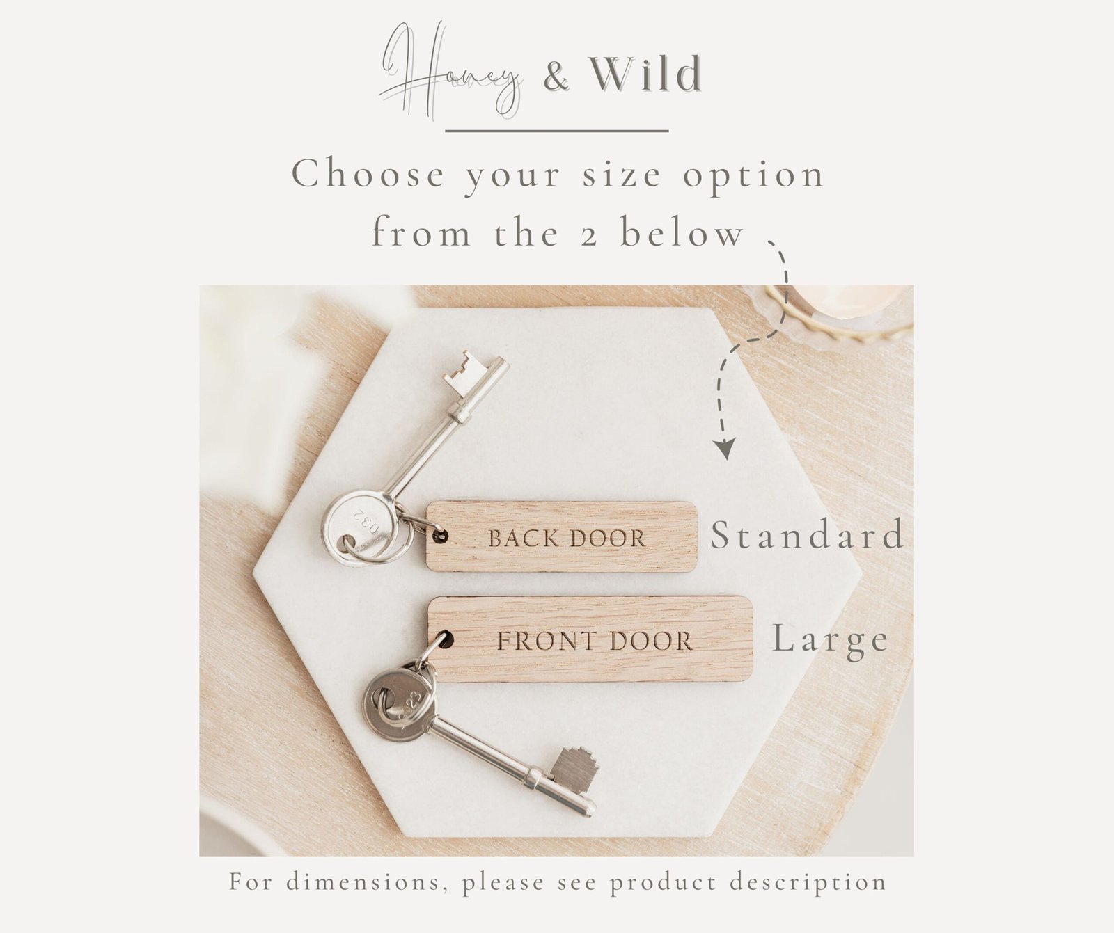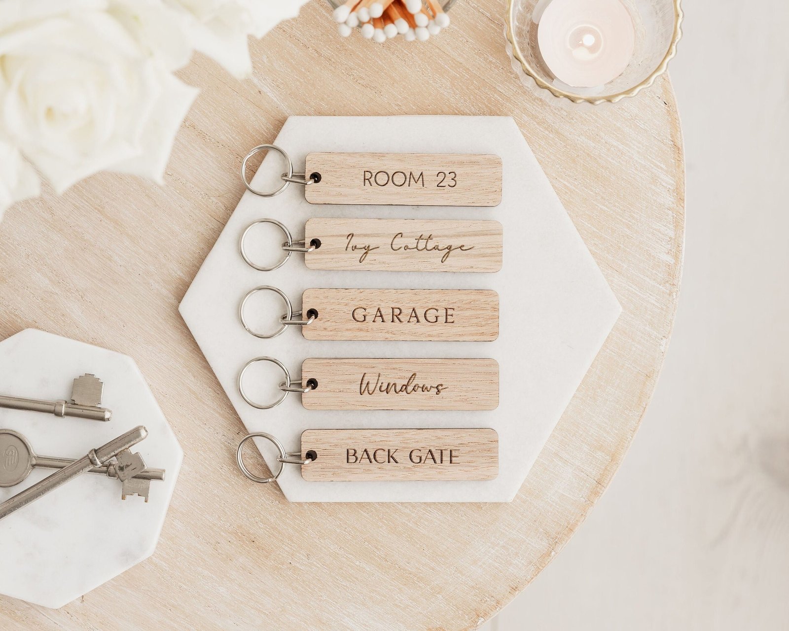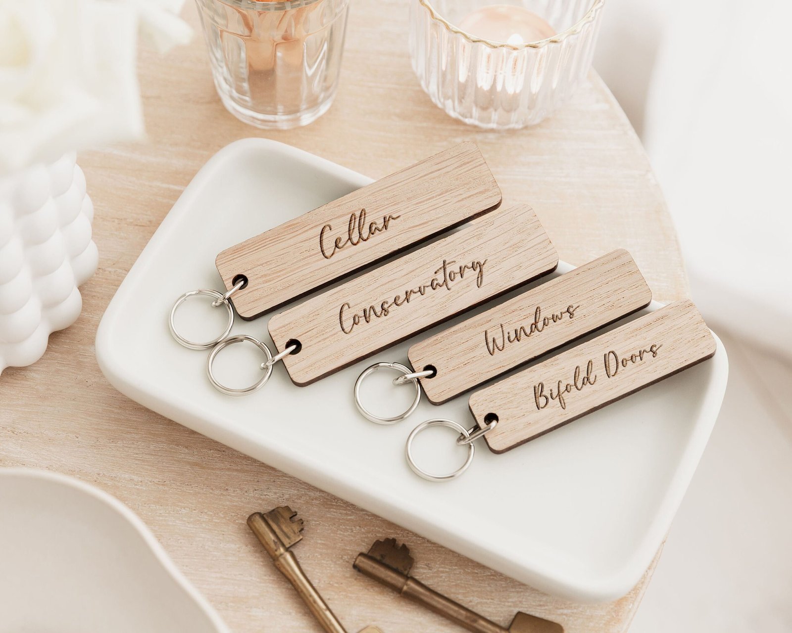 A beautiful laser engraved personalised keyring to help keep your keys organised around your home, work or holiday let/B\&B—the options are endless for their use! Choose from 4mm Oak, Cherry or Walnut – these are all real wood veneers which means they may have a slightly different grain and/or tone to the ones photographed in the listing. Every piece is as unique as the person using it.