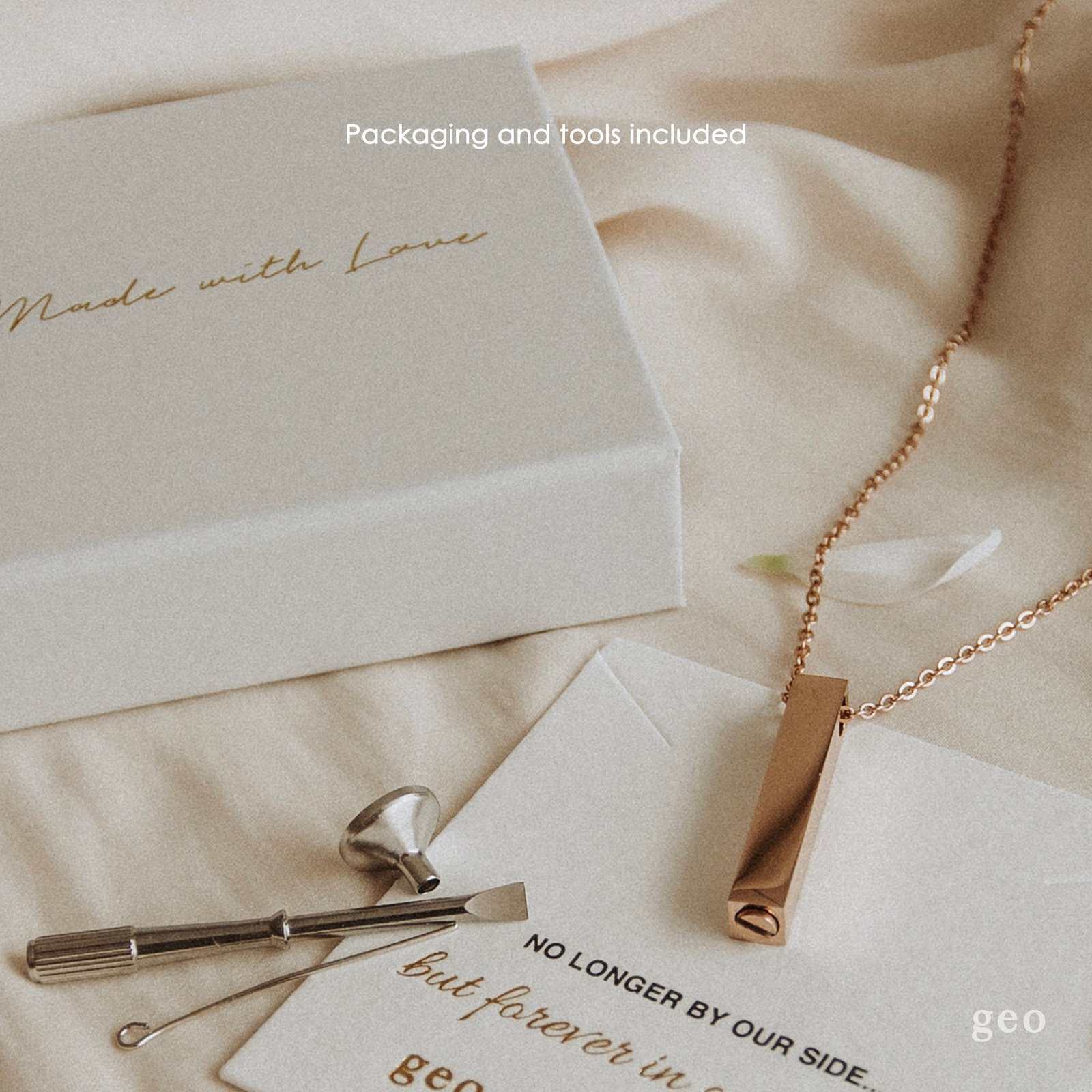 • 🔒 Secure Inner Chamber for Ashes The necklace contains a discreet compartment designed to safely hold a tiny portion of cremated remains. A screw-sealed opening ensures security and peace of mind.