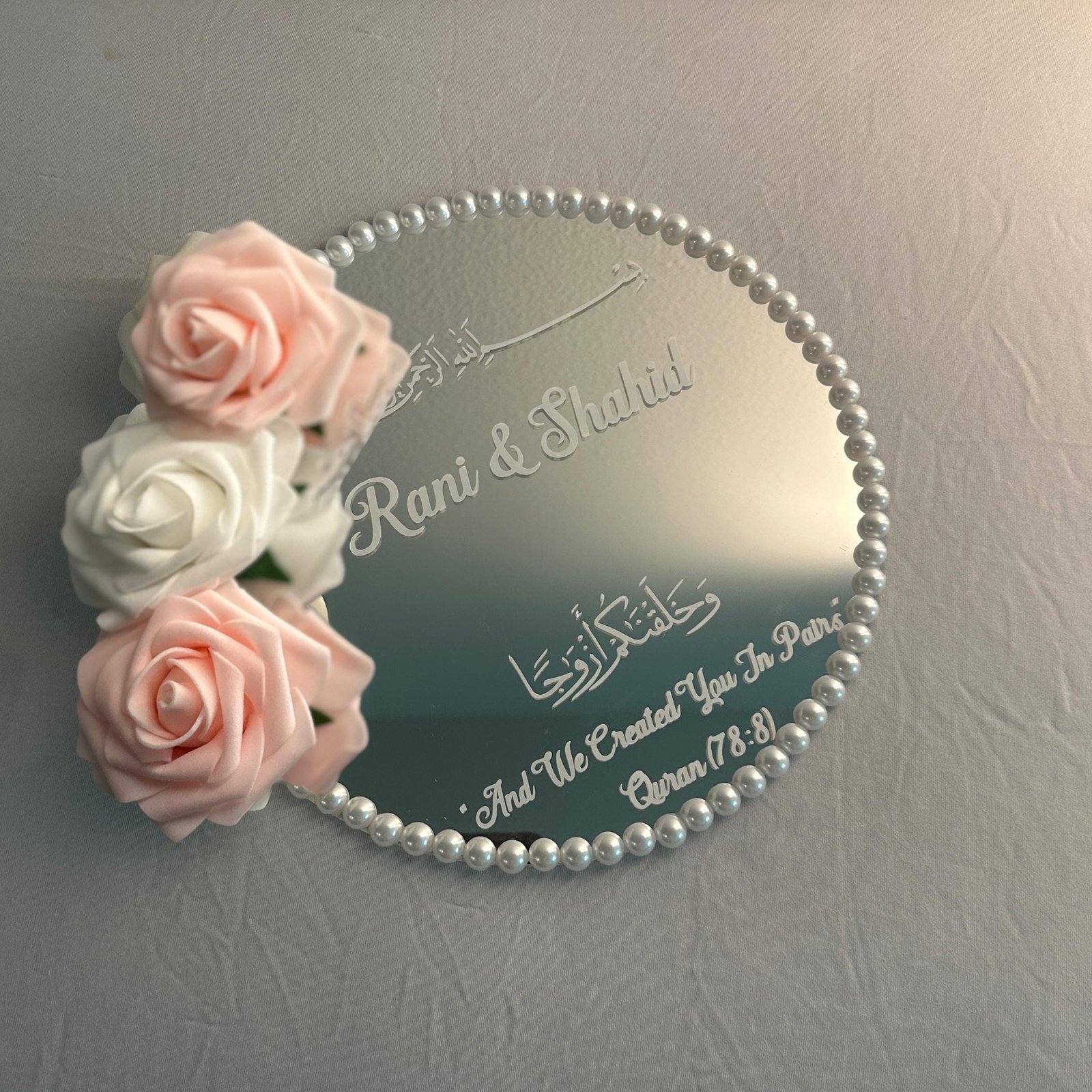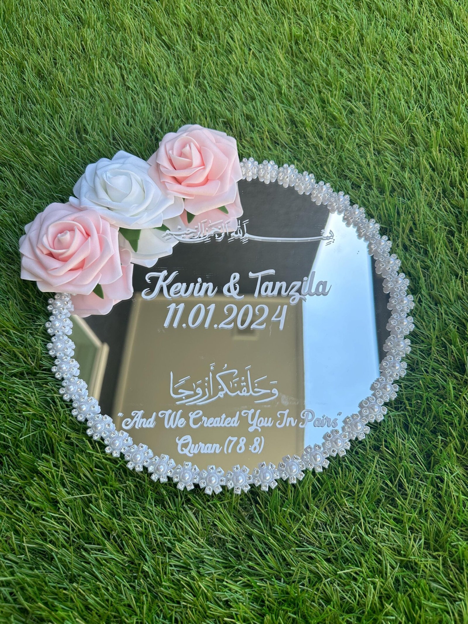 Enhance the elegance of your Nikkah ceremony with our beautifully crafted Customized Mirror Ring Plate. This exquisite piece is thoughtfully designed to hold your precious rings, symbolizing the union of two souls. Expertly personalized with your names and date, it serves as a timeless keepsake from your special day.