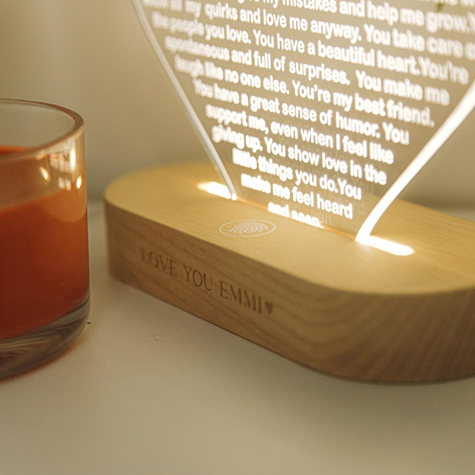 Light up her world with a custom heart night light—a perfect Christmas gift, a thoughtful 30th birthday surprise, a romantic gesture, or a touching anniversary present. Let love shine bright in the form of this personalized night light that symbolizes your deepest affections and conveys your heartfelt emotions in a warm and luminous way. Illuminate her heart and space with a gift that radiates love and togetherness.